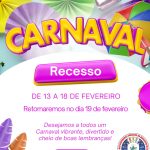 - Recesso de Carnaval 2026De 13 a 18 de Fevereiro Retornaremos no dia 19 de fevereiro Desejamos a todos um Carnaval vibrante, divertido e cheio de boas lembranças!